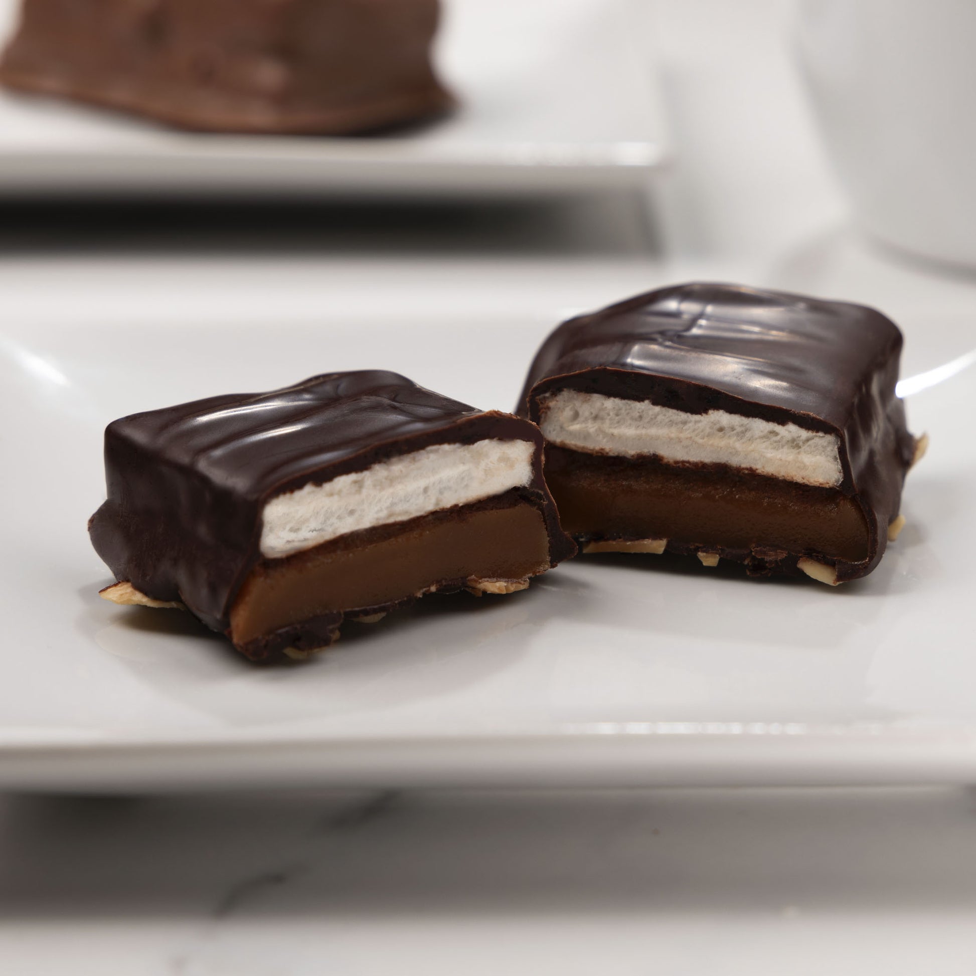 Fluffy marshmallow, rich caramel, with almonds, dipped in bold dark chocolate