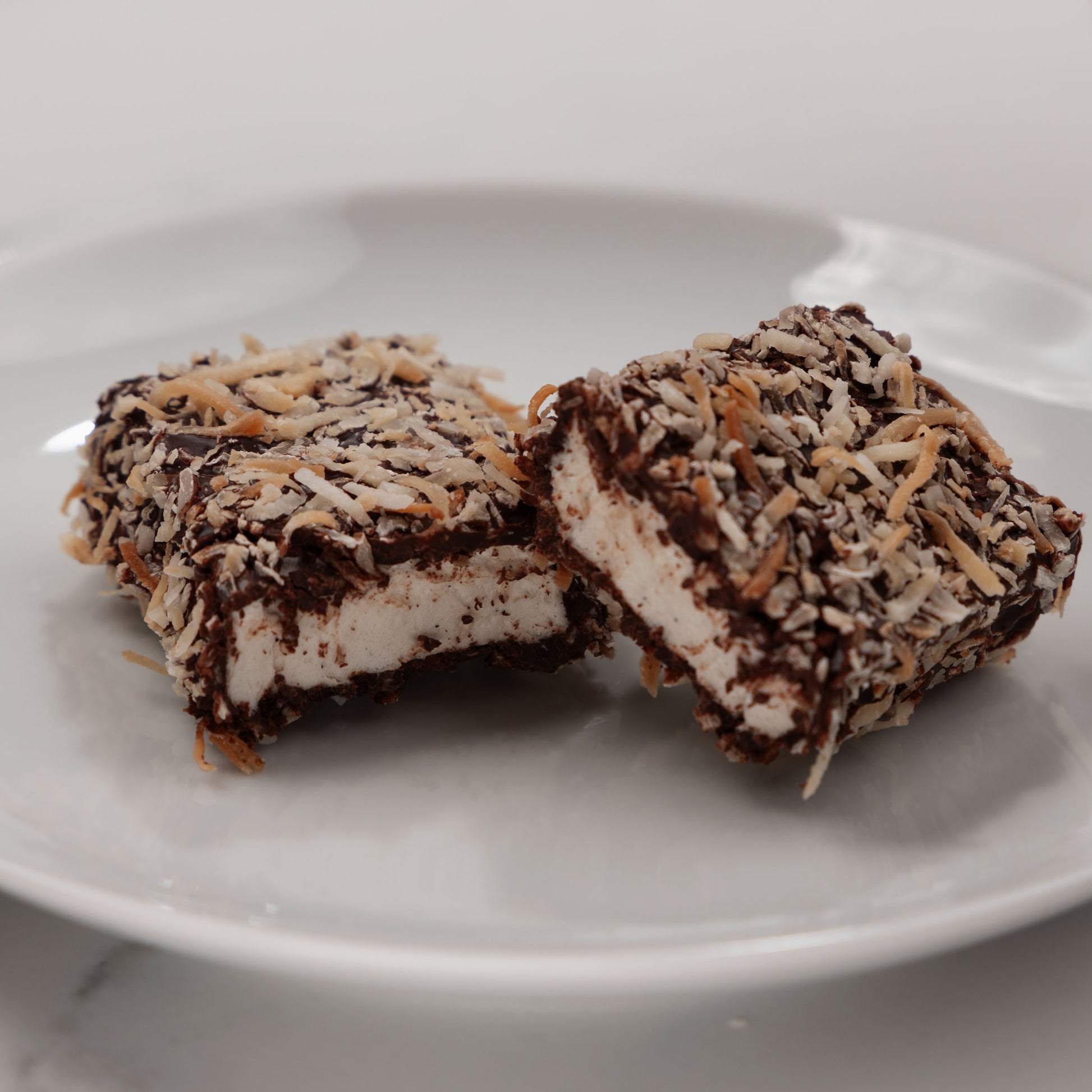 Fluffy marshmallow, dipped in dark chocolate and rolled in toasted coconut.
